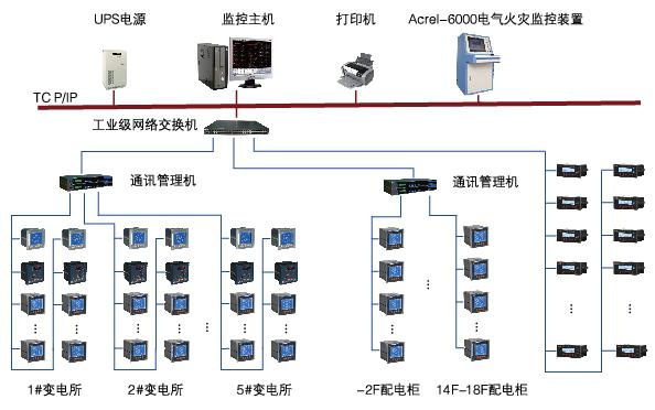 Acrel-6000電氣火災監控系統采用分層分布、開放式結構設計,由站控管理層、網絡通訊層和現場設備層組成。各電氣火災監控探測器通過屏蔽雙絞線RS485接口,采用MODBUS通訊協議總線型連接接入通訊服務器,然后通過五類線TCP/TP協議進入工業交換機,然后通過光纜到達監控主機。